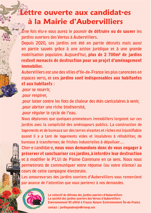Nous revendiquons des jardins pour toutes et tous. En plus de ceux qui existent, nous voulons de nouvelles parcelles ouvertes sur les quartiers et leur population. Le temps du bétonnage doit prendre fin, les ravages causés sont trop grands. A nous de réagir et poser les bases du monde que nous voulons voir advenir. Et celui-ci nest définitivement pas compatible avec celui de Grand Paris Aménagement, des Jeux Olympiques et leur cohorte de saccages environnementaux et sociaux.