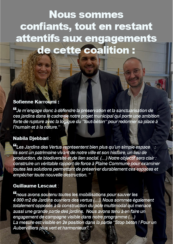 A Aubervilliers, la préservation de ces jardins est une nécessité. La ville compte 1,42 m2 despaces « verts » par habitant·e. A lheure de la débâcle écologique, sanitaire et sociale, perdre un hectare de surface cultivable en plein coeur de la Seine-Saint-Denis, dans la deuxième ville la plus pauvre de métropole est un écocide. Ce qui sera détruit sera irrémédiablement perdu. Les logiques de compensation que Grand Paris Aménagement, la Solideo, la Mairie dAubervilliers, le comité de lassociation des Vertus essaient de vendre narrangent que les bétonneurs et la spéculation immobilière. Pendant que les plaquettes des promoteurs vantent honteusement leur éco-quartier en béton et leur solarium inabordable, sur les Jardins nous construisons à partir de récup, nous réutilisons, nous compostons, nous mangeons ce qui pousse ou ce qui allait être gaspillé, nous construisons à la main en terre et paille, nous faisons pousser, nous ménageons, nous cohabitons, nous laissons vivre.